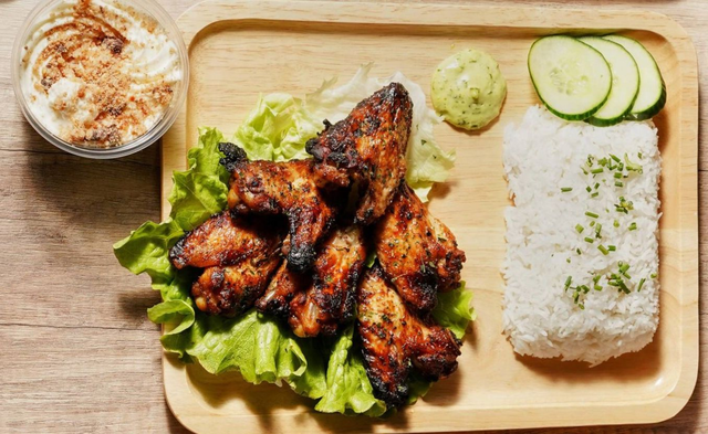 -un plat chaud: cuisse de poulet braisé accompagné de riz, sauce tomate.